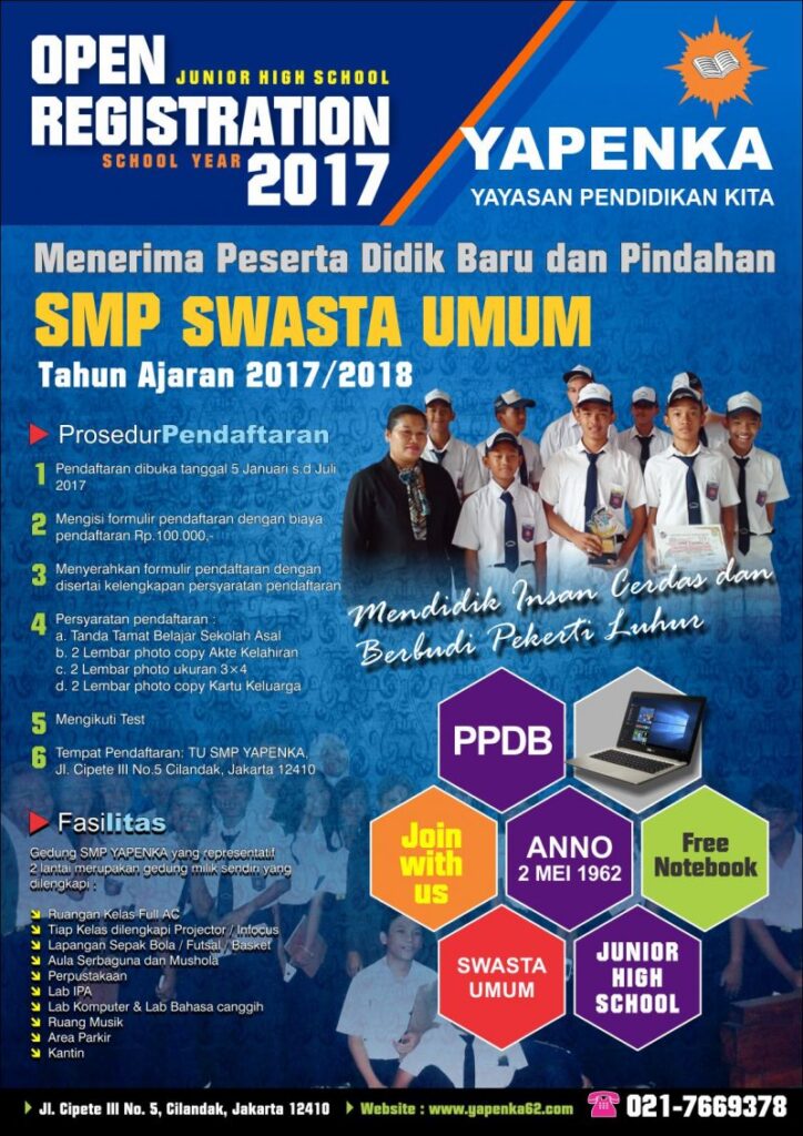 SMP Yapenka Cipete, membuka pendaftaran Penerimaan Peserta Didik Baru tahun ajaran 2017/2018. Silahkah Klik Brosur dibawah ini untuk perbesar. DOWNLOAD